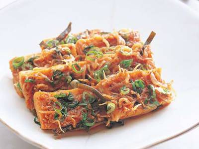 辛さの中にうまみが詰まった韓国風の煮物です。豆腐に焼き色をつけ、だしになるものを入れ、ヤンニョムと水を加えて煮るだけ。