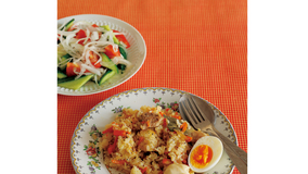 中からゆで卵が顔を出すハンバーグ。肉ダネにヨーグルトやクミンシードを加えて、いつもとは違う異国情緒あふれる味に仕上げます。しょうゆ風味のソースがしみたバターライスと一緒に。
