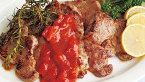 厚切り肉のソテーと、トマトソースの相性は抜群。ソースの隠し味にしょうゆを加えるのがポイントです。