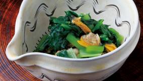 香りよく仕上げたかつおのローストに、塩らっきょうを添えて、葉わさびのドレッシングでいただきます。