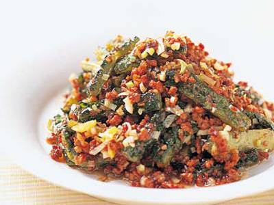 甜麺醤とひき肉を炒める料理は、四川料理では有名です。ゴーヤーを揚げることで苦みをやわらげ、食べやすくします。