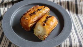 さつまいもの甘みをクリームチーズの塩けが引き立てます。仕上げに「はちみつバターソース」をコーティングしてつややかに。