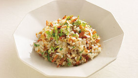 いり卵と、じゃこのコントラストがシャキシャキ生野菜のサラダに小気味よいアクセントを添えます。