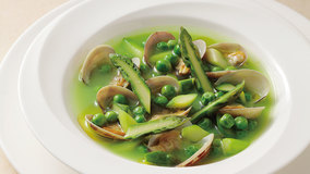 あさりのうまみのきいた色鮮やかなスープ。仕上げにおいしいオリーブ油をサッとかけてどうぞ。