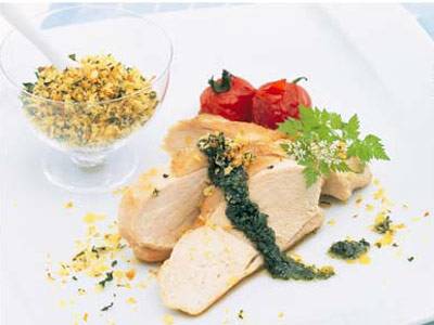 パン粉に入れるバジルをソースにも。オレンジ風味のハーブパン粉とのダブル使いで香り豊かな仕上がり。