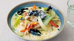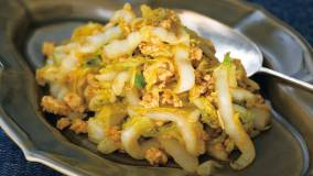 白菜と豚肉にたっぷりのしょうがを加え、蒸し煮風に仕上げた鍋。しょうがの刺激と柚子(ゆず)こしょうの風味でうまみが増します。