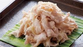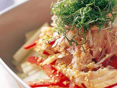 豚肉にかたくり粉をまぶしてゆでるとうまみを逃がさず、のどごしもよくなります。わさびで辛みをきかせた、清涼感あふれる一皿。