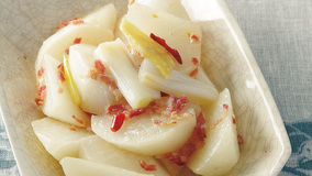 大根の先端部分を赤とうがらしとしょうがで煮たピリ辛味の煮物です。ベーコンのうまみと大根の歯ごたえがポイントです。