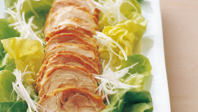 一見手間のかかったチャーシュー風は、クルンと丸めて下味をつけ、レンジにかけただけ!ラクラクのごちそう肉料理です。