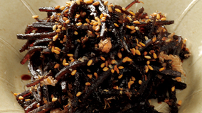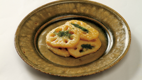 れんこんを風味よく焼き、ホクホクの食感に。濃厚なごまだれがよくからんで、食べごたえのある一品です。