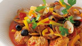 フライパンだけで手軽につくる、トマトやパプリカを使ったバスク風の煮込み。ポカポカの基礎栄養素ともいえるたんぱく質を、ふんわり丸めた柔らかな豚肉と大豆の、ダブルでとり入れます。