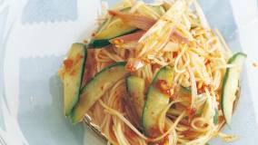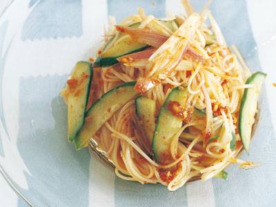 生野菜をたれであえれば“生ナムル”の完成。きゅうりとみょうがのさわやかな一品をどうぞ。