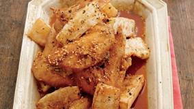 名古屋風の甘じょっぱい手羽先のから揚げに、揚げ大根をプラスします。表面はカリッと、中はジューシーな大根の食感は新鮮です。