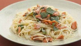 うまみたっぷりのさば缶は、汁ごと使ってパスタのソースに。たまねぎの甘みが、全体をマイルドにまとめてくれます。仕上げに加える青じその爽やかな香りがアクセントに。