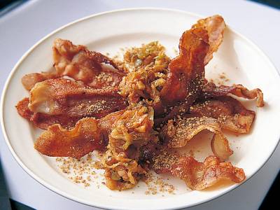 豚カツ用より薄いしょうが焼き用の豚肉を使い、少ない油で揚げ焼きにします。パン粉には粉チーズを混ぜるからソースいらず。野菜はサラダ仕立てでさっぱりと。