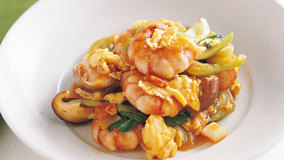 辛くて甘酸っぱいチリソースを、プリプリのえびにたっぷりからめます。溶き卵を最後に回し入れて、まろやかな味わいに。
