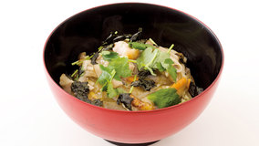 五目炊き込みご飯の具を多めに煮ておき、炊き込みご飯とはまったく違う丼物を。