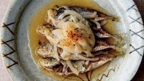 油っぽさがなく、表面に味をまとった小あじはツルリとなめらかな口当たり。すだちを搾って、さっぱりとどうぞ。