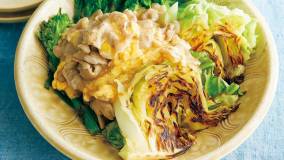 甘辛味のしょうが焼きとトロッとしたスクランブルエッグでボリューム満点。水菜で彩りを添えて食欲をそそるワンパンプレートに。