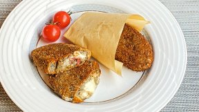 福島の郷土食「凍みもち」に、チーズとベーコンを挟んでカツレツに。凍みもちの草の香りがハーブのようで、チーズとの相性も抜群です。ファストフード感覚で楽しんでください!