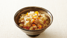 ご飯と一緒に炊き上げたホックホクのさつまいもとしらす干しの炊き込みご飯。しらす干しのやさしい塩けと、さつまいもの甘さがよく合います。