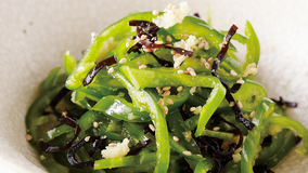 下ごしらえでピーマンのクセを除き、塩昆布のうまみと塩けをプラスします。しょうがの風味がアクセントになります。