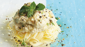 焼いたなすの香ばしさが食欲をそそる、夏にぴったりの冷製パスタ。ツナとアンチョビでコクを出した焼きなすペーストに、パスタがよくからみます。冷製なので量も少なめにして、あっさりいただきます。