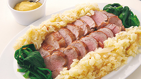 フライパンでつくれるお手軽ロースト。表面をこんがり焼いたら、アルミ箔(はく)をかぶせてじっくりと蒸し焼きにし、ジューシーに仕上げます。少し厚めに切り、マスタードをつけて味わうのがおすすめの一品です。