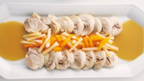 はまぐりの上に、ほんのりみそ味のたけのこをのせて。みずみずしいチコリの食感もマッチした楽しいオードブルです。