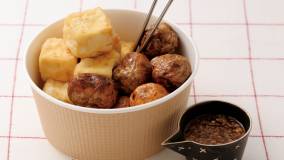 れんこんとしいたけで肉ダネをはさみ、少ない油で揚げ焼きにします。香りたつ”ねぎしょうがだれ”が絶妙です。