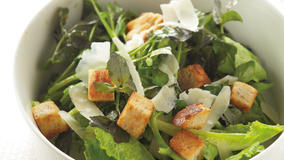 時間がたって堅くなってしまったパンでもこんがり焼けばクルトン代わりに! ロメインレタスにクレソンを混ぜると、歯ごたえとほろ苦さが加わり、味に奥行きが生まれます。