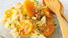 ザワークラウトの酸味と柿の甘みがよく合います。くるみの食感がアクセントに。柿の代わりに梨やりんごでつくるのもおすすめです。