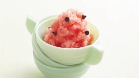 すいかの果肉と果汁にゼラチンを混ぜて凍らせた、ふんわりとした食感のシャーベット。仕上げにチョコチップを飾って、本物のすいかのように仕上げます!