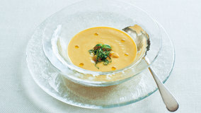 とうもろこしはたまねぎと炒めて甘みを引き出し、牛乳と生クリームでコクを、バジルで香りをプラスします。なめらかなのどごしのスープです。