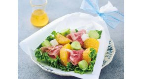 オーブン用の紙に包まれたカラフルなサラダは、まさに“食べるブーケ”!オレンジの香りを移した甘酸っぱいドレッシングが、爽やかな味わいです。