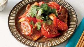 かたくり粉をまぶして焼いた鶏肉は、ふっくらとしてジューシーな仕上がり。甘酸っぱいトマトの果汁と酢豚風のたれがトロリとからみます。