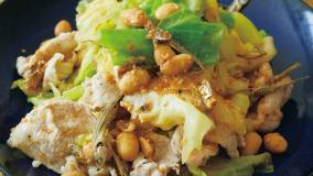 つくり置きできる「いりこ酢大豆」はコクがあって甘酸っぱく、キャベツと豚肉の甘みを引き立てます。あえ衣のように使えるので、幅広い料理に重宝します。