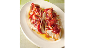 トマトソースに梅干しの酸味を合わせて青じそを散らしたおしゃれな一皿。ほのかに香るにんにくと仕上げのオリーブ油でイタリアンに。
