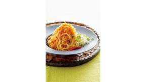 松前漬けの原形ともいわれる「いかにんじん」が焼きそばの具に?!いかの風味、酒のうまみ、香ばしく焼き上げた麺と見事にからみ、シンプルながら味わい深いおいしさです。仕上げにふった粉ざんしょうが、何とも後を引きます。