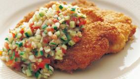 チーズをのせて揚げ焼きにし、こってりとしたソテーに。添え野菜代わりに、野菜たっぷりのソースをかけます。