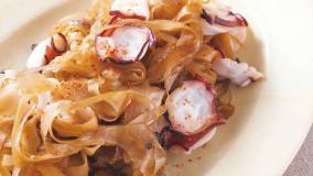 アクが少なく、繊維も柔らかな新ごぼう。リボン状にピーラーで薄切りにして、弾力のあるたことの食感の違いを楽しみます。