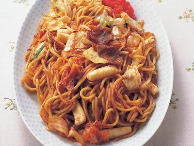 キムチの辛みをきかせた大人の焼きそば。トウバンジャンで辛みは調節してください。
