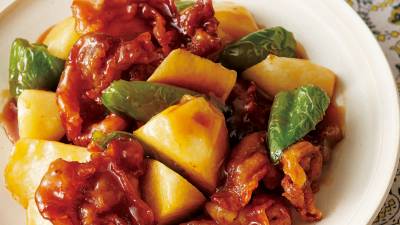 柔らかくなるまで煮込んだ牛肉が主役。野菜はあとから加えて程よい歯ごたえに仕上げます。