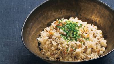 しめじは少し焼いて香ばしさを出します。食感が保たれるよう、のりは最後に加えます。