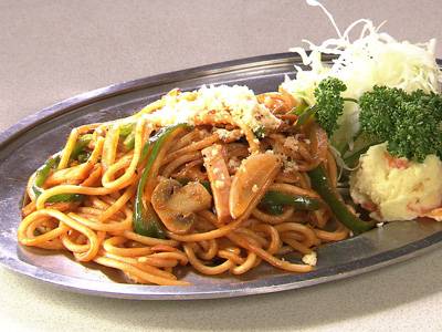 濃厚なケチャップ味がしみ込んだ具をスパゲッティによく混ぜます。ベーコンは、薄切りにしたソーセージやハムにかえても。