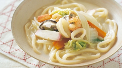 野菜や魚介のうまみが溶け出たマイルドな豚骨風スープが簡単に。チャンポン用の麺のかわりに冷凍うどんを使って、ぐんと手軽に!