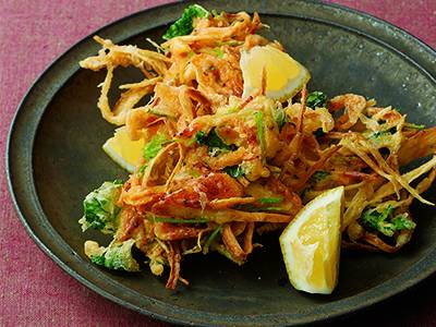 衣をサックリ仕上げるために、小麦粉にかたくり粉をプラスします。卵は卵黄だけ使うのもポイントです。いろいろな歯ざわりが楽しい!