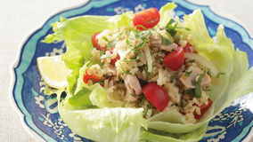 すっかりおなじみとなったタイ料理・ガパオのバジルを、たっぷりの青じそにかえて。ちぎったレタスにご飯と一緒に少量ずつのせて、パーティー風に。丼に盛って温泉卵をのせれば、おうちごはんにも。