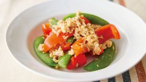 蒸し煮にしたパプリカは甘くてジューシー。スナップえんどうと大きさを合わせて切り、歯ざわりの違いを楽しみましょう。