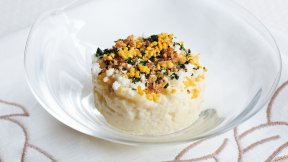 蒸したてのじゃがいもをつぶしてビネグレットソースをなじませれば、クリーミーで味わい豊かなポテトサラダのでき上がり。好みのトッピングで彩りましょう。